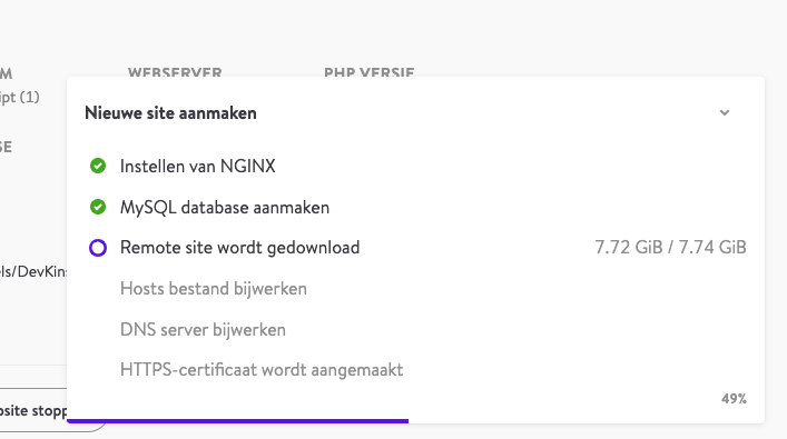 we have reviewed the site logs you have sent via DM, however those contain only PHP errors and not those that might happen during a process. In order to troubleshoot this we would need the main.log file. You can find it by clicking on the question mark icon at the bottom left corner of DevKinsta and then on Reveal log file in File Manager.